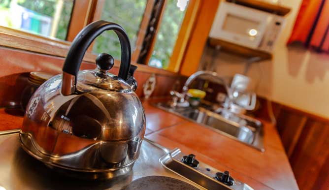 Cabin #1: one bedroom with 1 double bed, the other bedroom with 2 single beds. 1 bathroom, sitting area, fridge